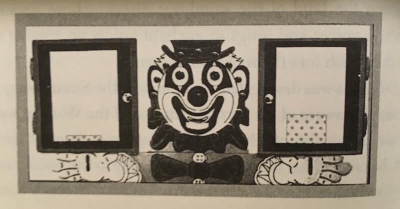 In addition to the delayed gratification studies with marshmallows, Mischel and his then-graduate student Charlotte Patterson conducted experiments involving a device developed to be highly enticing and distracting to young children: the “Mr. Clown Box” experiments. These aren’t as well-known as the marshmallow experiments in general culture, but revealed some strategies to resist temptation/distraction. Preschool children were given a task to do in a room that also contained a box featuring a clown face and cabinets of toys visible within; an integrated speaker allowed the clown to “talk” to them, trying to entice them to play with the toys rather than working on the boring assigned task . (I find this a bit creepy – “Come play with the toys INSIDE ME!!!“, but the 70s were a different time, I guess.)