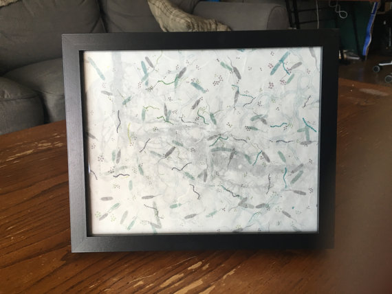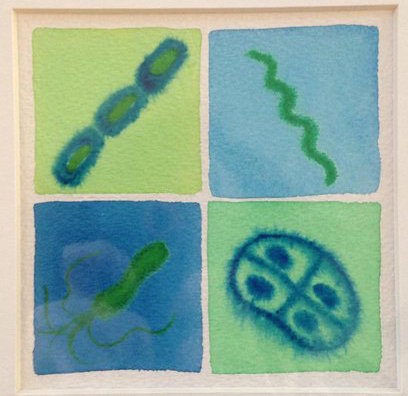 Michele Banks (artologica Etsy site) is another amazing artist. A Streptomyces watercolour painting by Michele was my first ever Etsy purchase (see top of the page for a picture of that), and I was the recipient of a kind gift of a custom-ordered painting featuring some of my all-time favourite bacteria, shown here. I also have a couple of her scarves … and as I was just browsing her store, I see there are a bunch of new scarf designs, along with several new paintings!